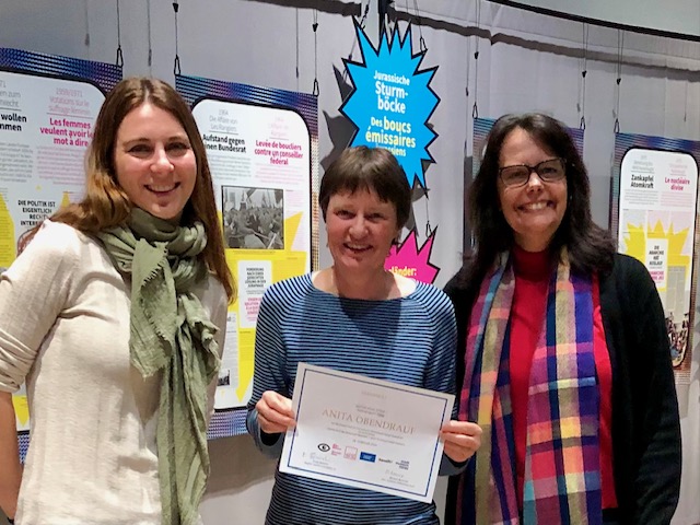 Von links nach rechts: Mirjam Brunner (Stadtmuseum Aarau), Anita Obendrauf (Gewinnerin Kategorie Erwachsene) und Ko-Kuratorin Katja Bianchi